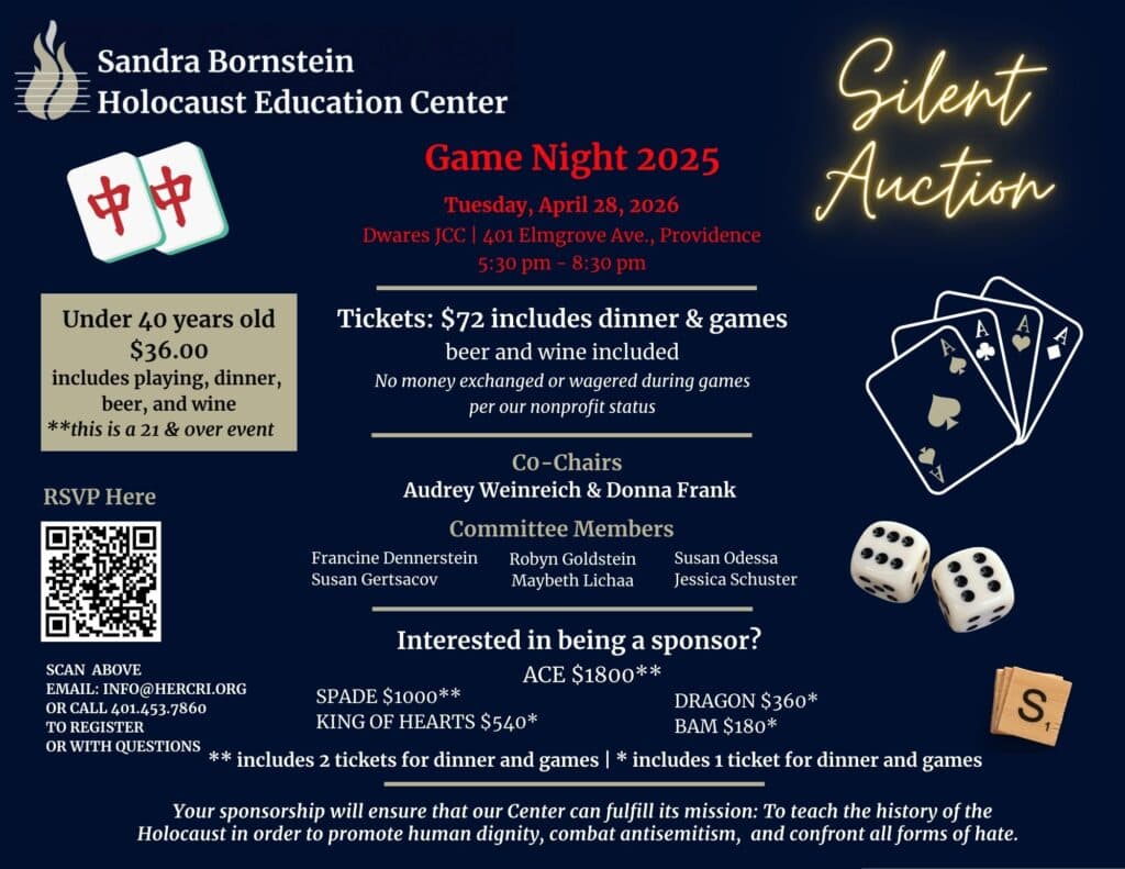 Join us for an exciting evening of community, games, and fun in support of the Sandra Bornstein Holocaust Education Center. Your sponsorship will help ensure that our Center continues to fulfill its mission: to teach the history of the Holocaust in order to promote human dignity, combat antisemitism, and confront all forms of hate.